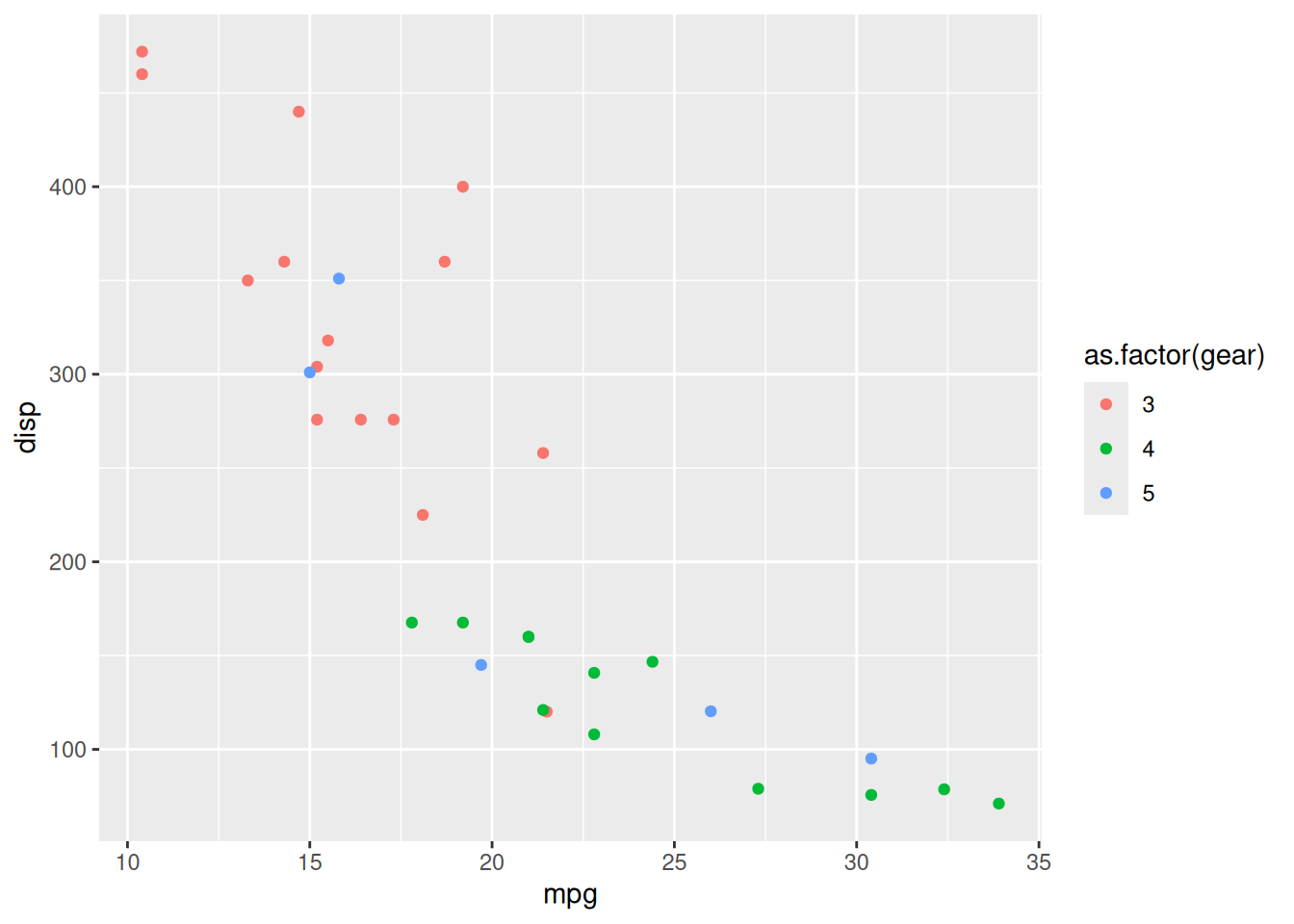ggplot(data = mtcars, mapping = aes(x = mpg, y = disp, colour = as.factor(gear))) +