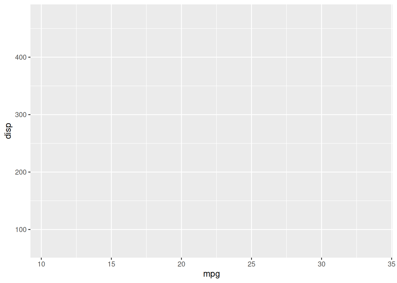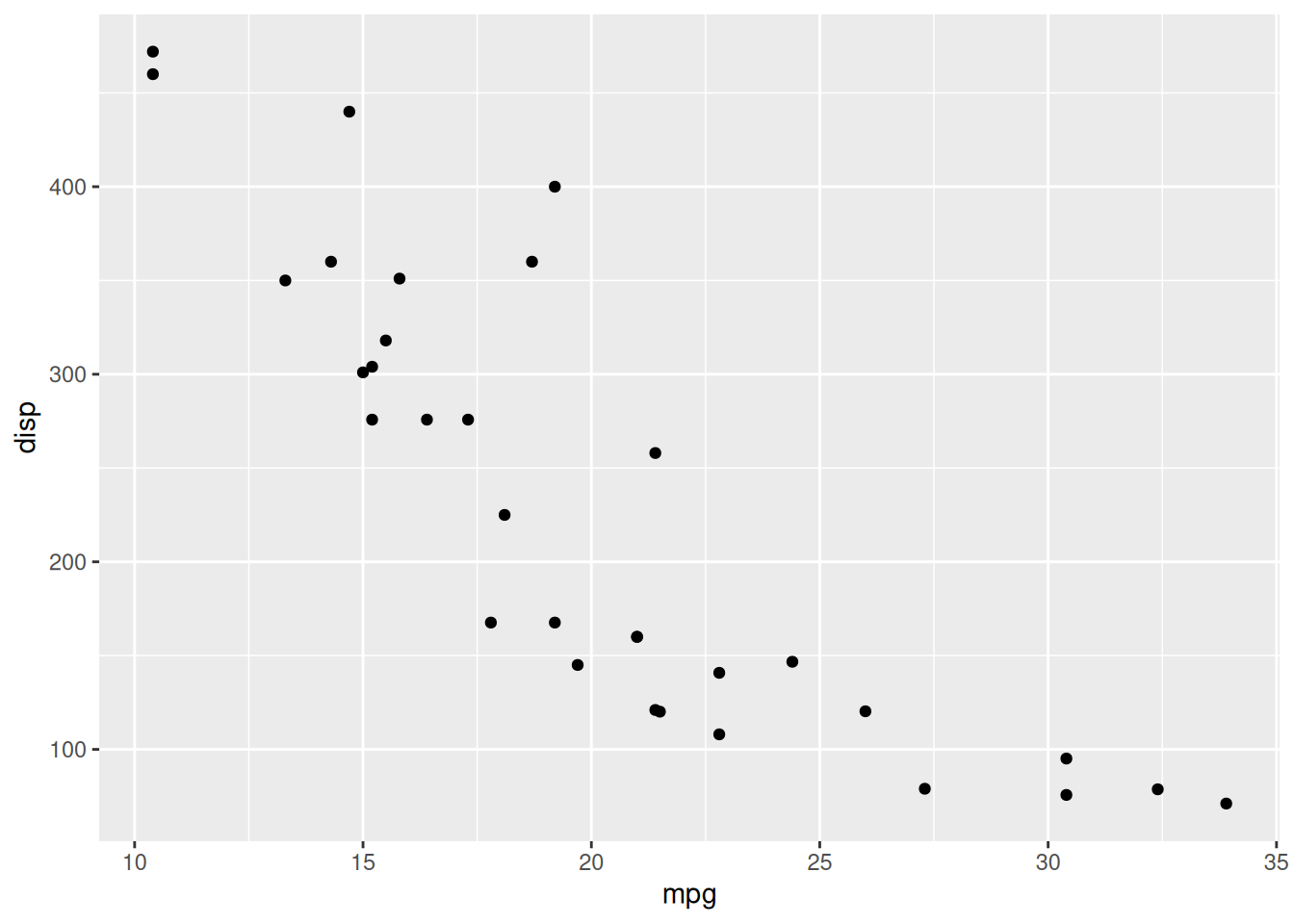 ggplot(data = mtcars, mapping = aes(x = mpg, y = disp)) +